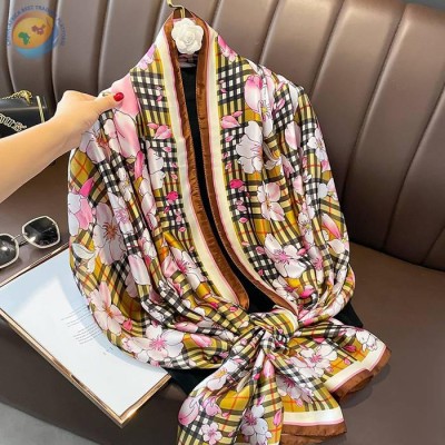 夏季格子条纹优雅花卉款仿真丝长款围巾