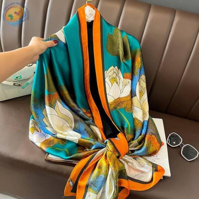 春秋花卉拼接色百搭丝巾拼接欧美装饰围巾
