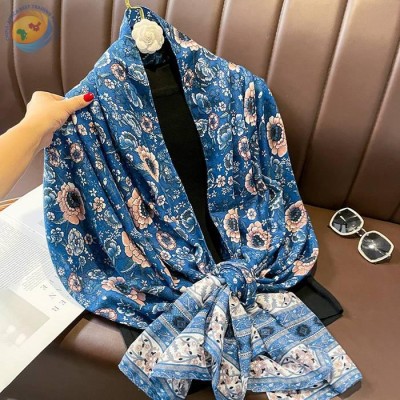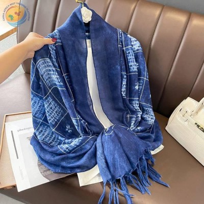 民族风春秋新款蓝色系棉麻手感薄款围巾