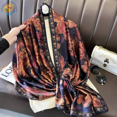 中国风玫瑰花卉酒红色气质仿真丝外搭披肩围巾