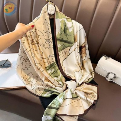 韩版春秋款绿色油画花卉100%桑蚕丝围巾