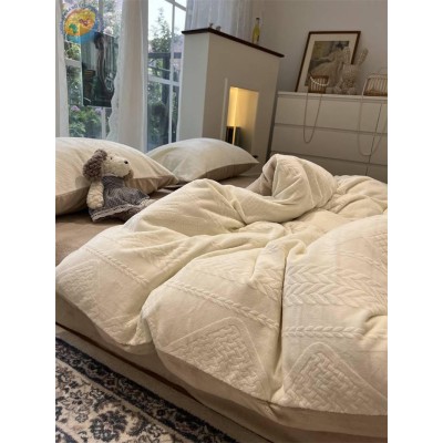 ins Lamb wool four-piece set cute cartoon embroidery Class A milk velvet double-sided velvet autumn and winter thickened bedding