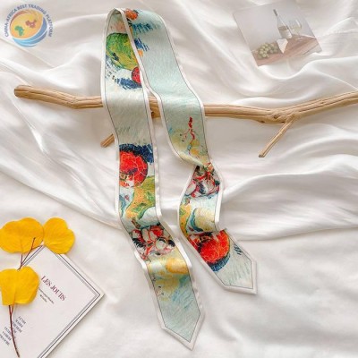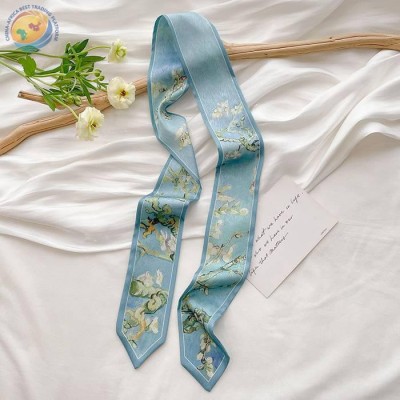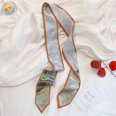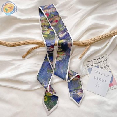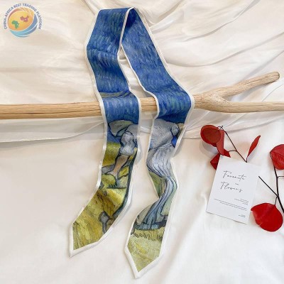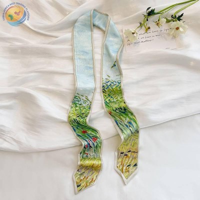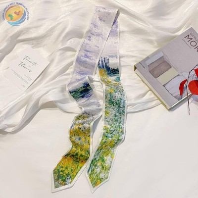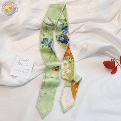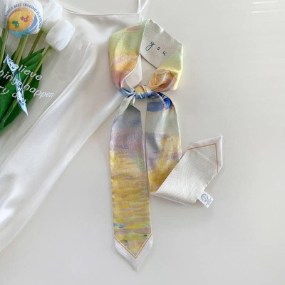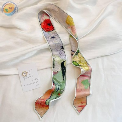 Sharp corner oil painting style printing spring/summer ribbon long silk scarf woman