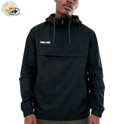 Custom Design Men Overhead Pullover Waterproof Polyester Black Windbreaker Jacket Men Hooded Jacket With Half Zip