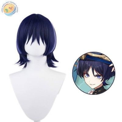 Anime original God Fool Scattered Soldier cos wig simulation long scalp dark blue with highlights chemical fiber head cover