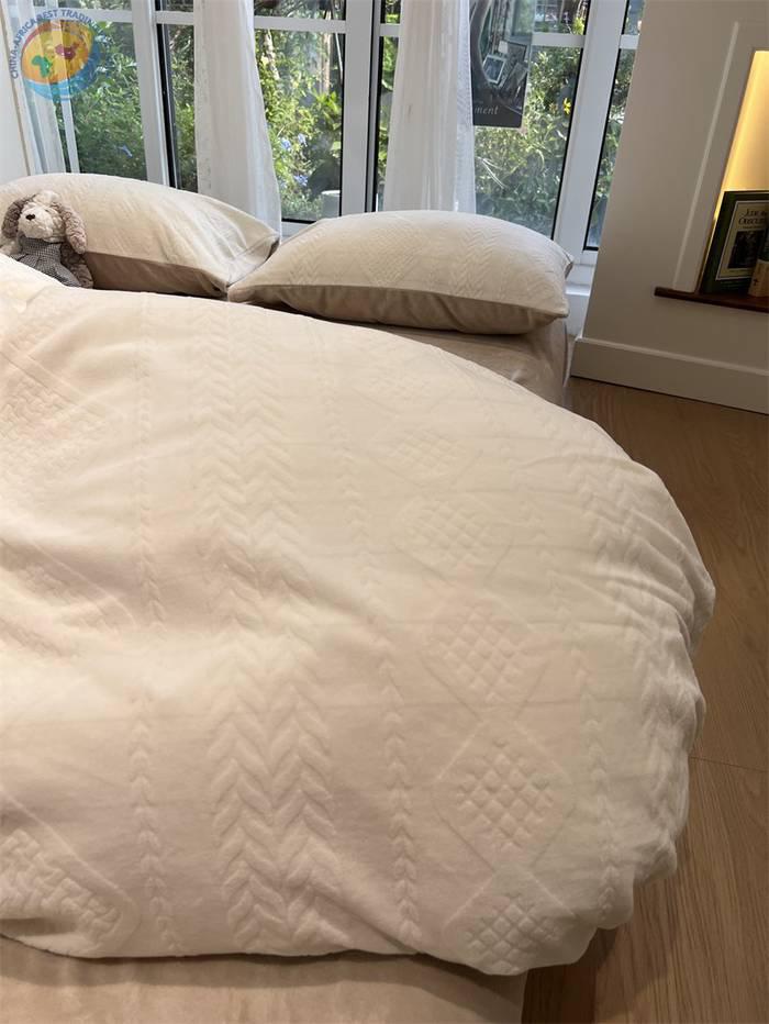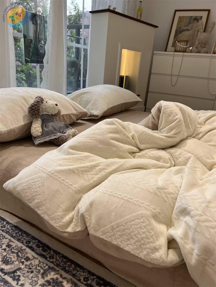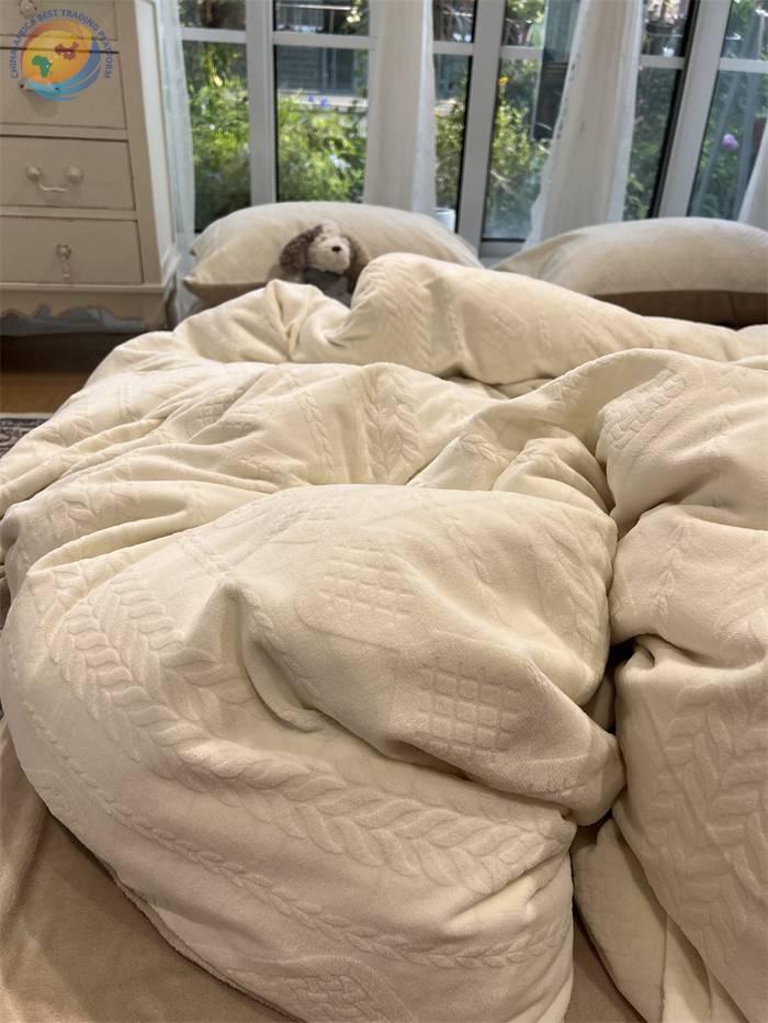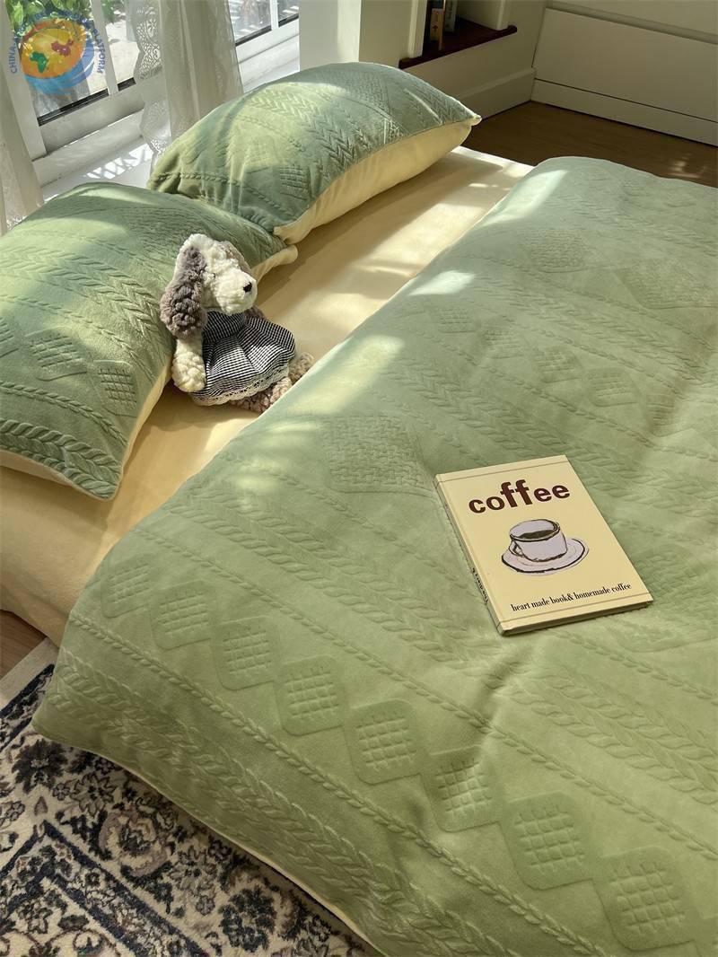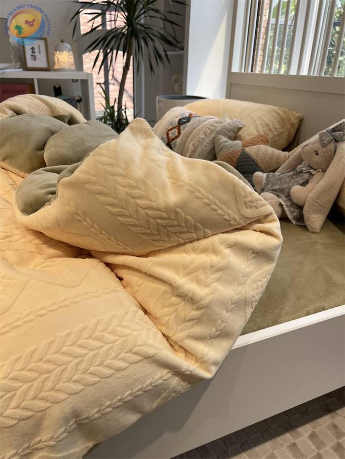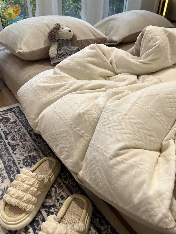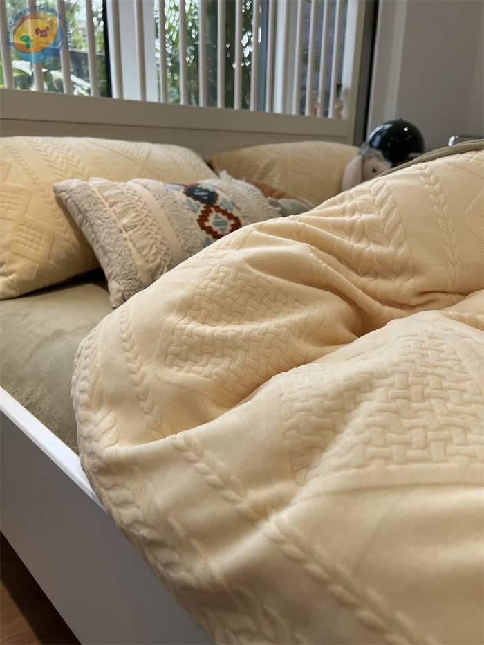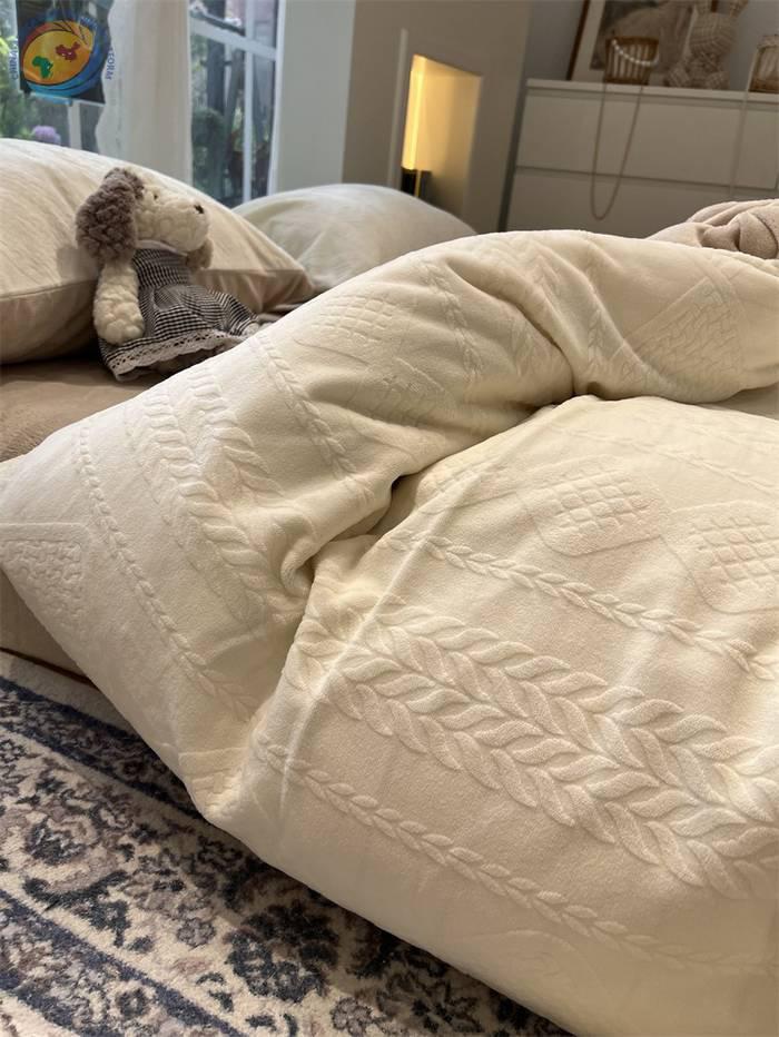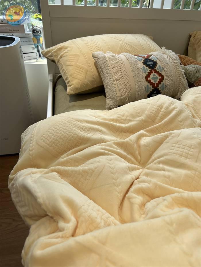 ins冬季法兰牛奶绒立体雕花简约奶黄色床上四件套珊瑚绒1.5m1.8米