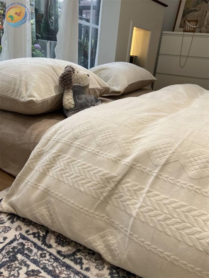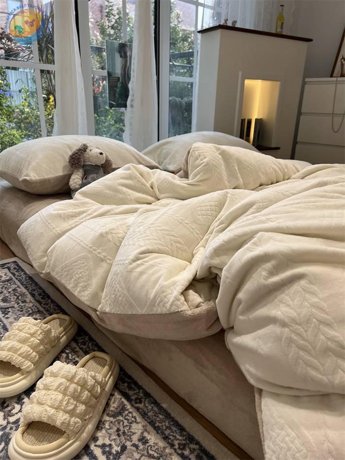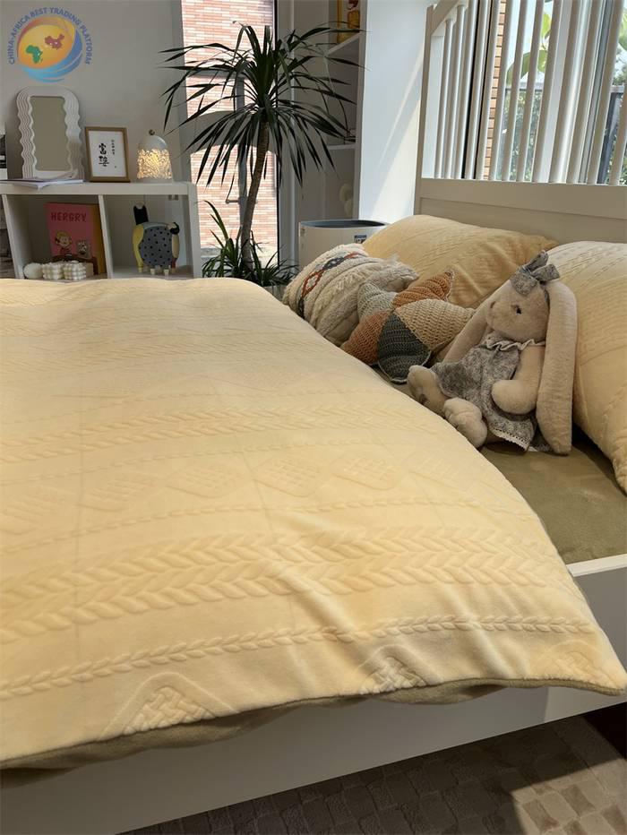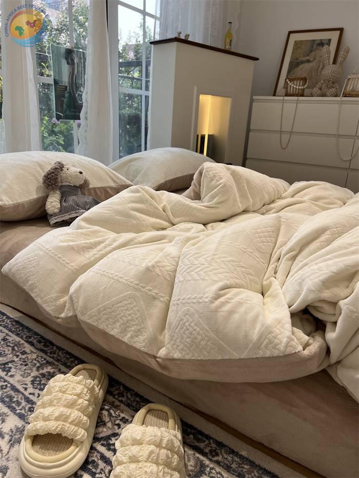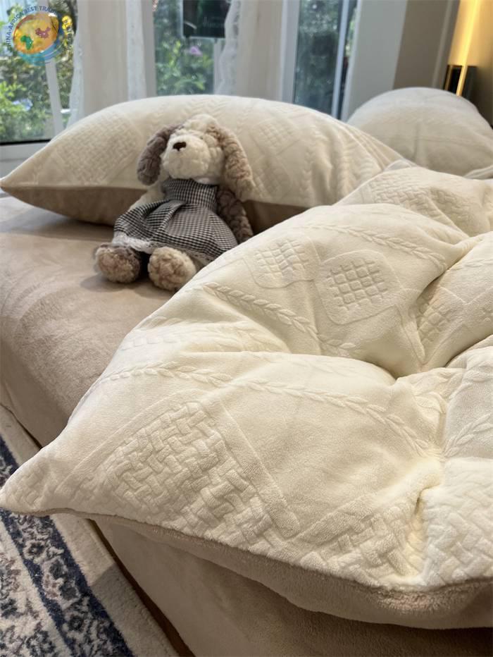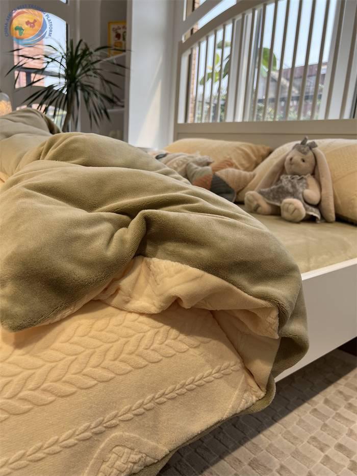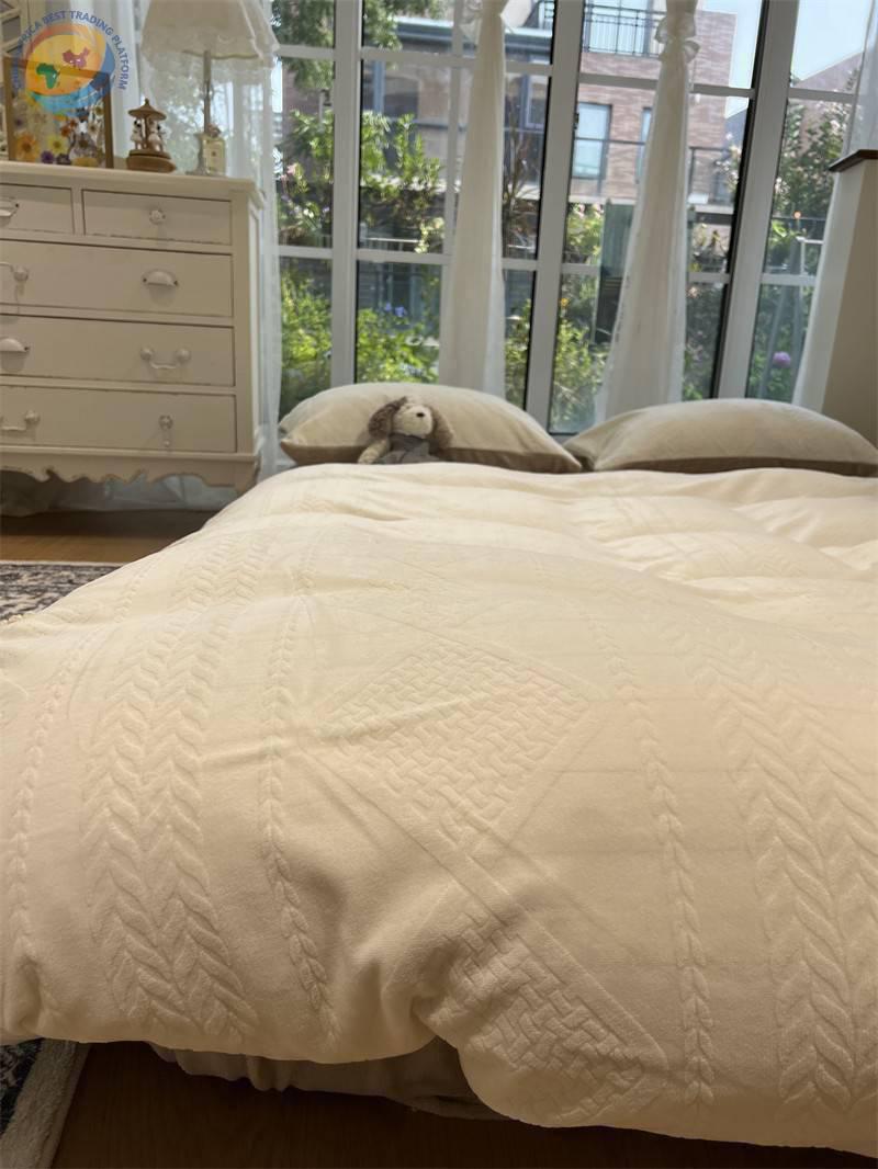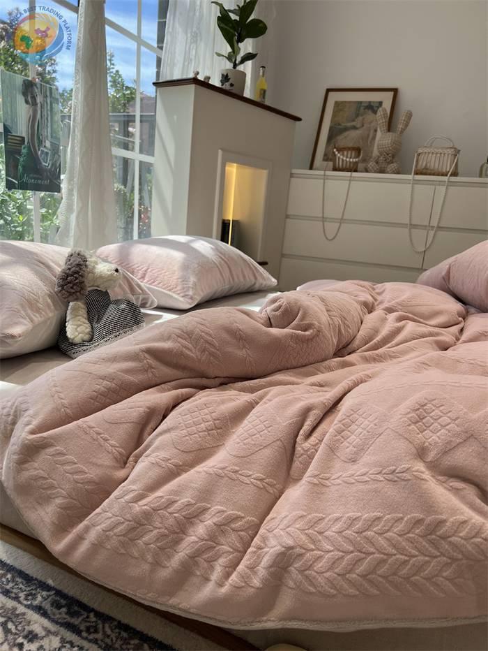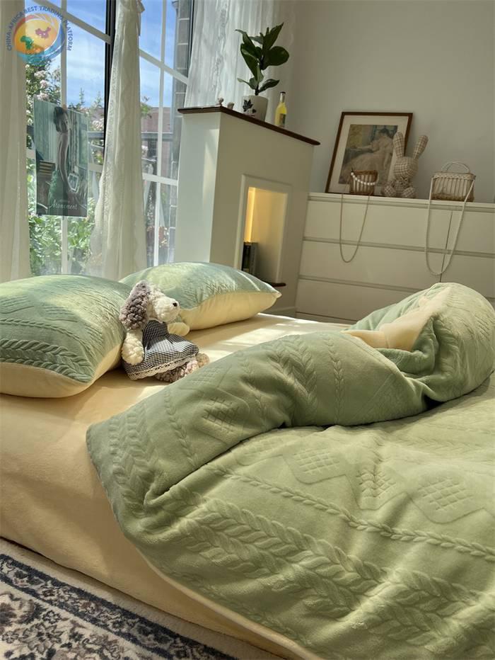ins冬季法兰牛奶绒立体雕花简约奶黄色床上四件套珊瑚绒1.5m1.8米