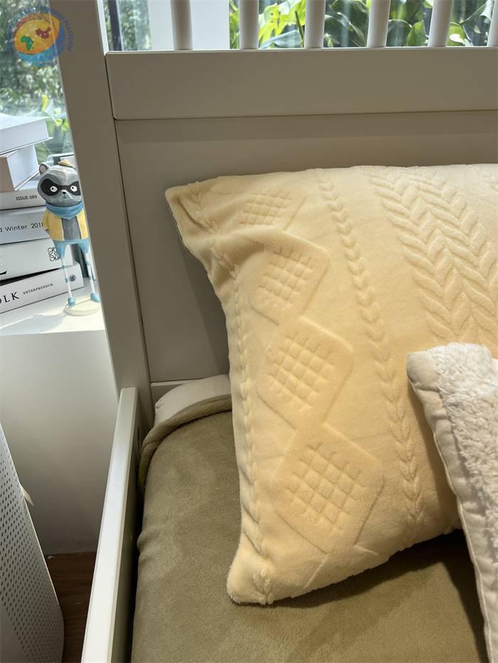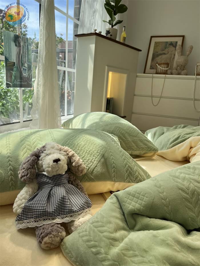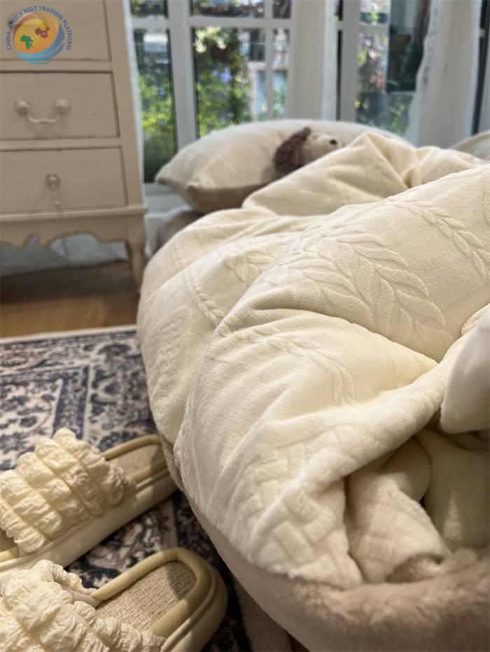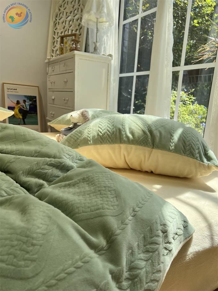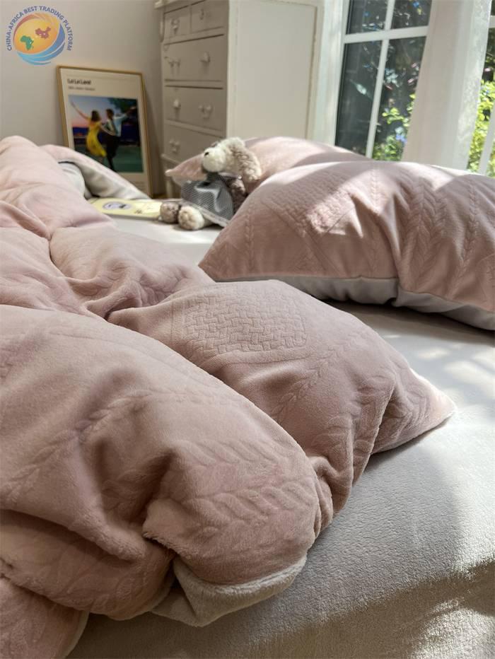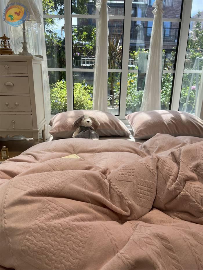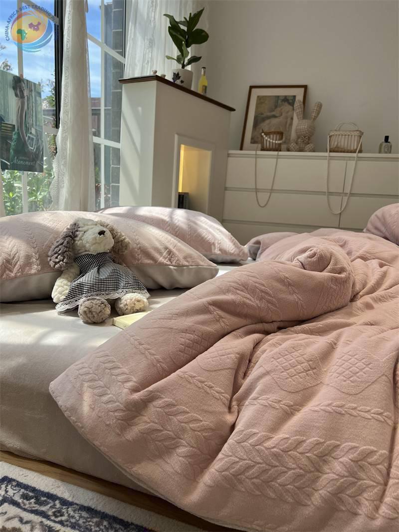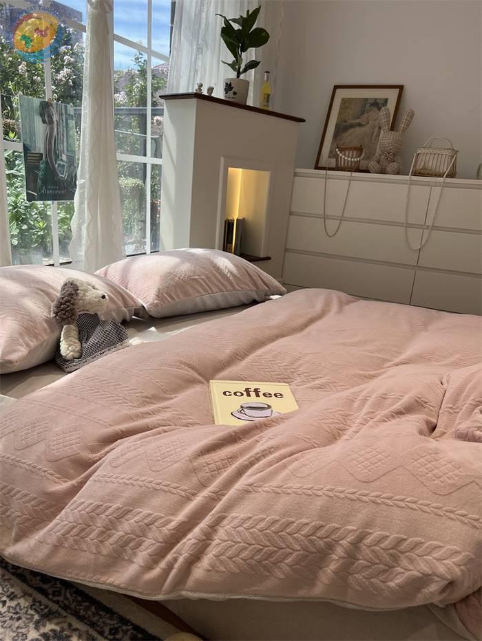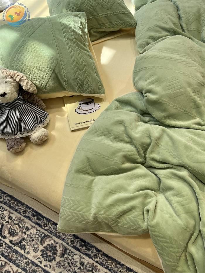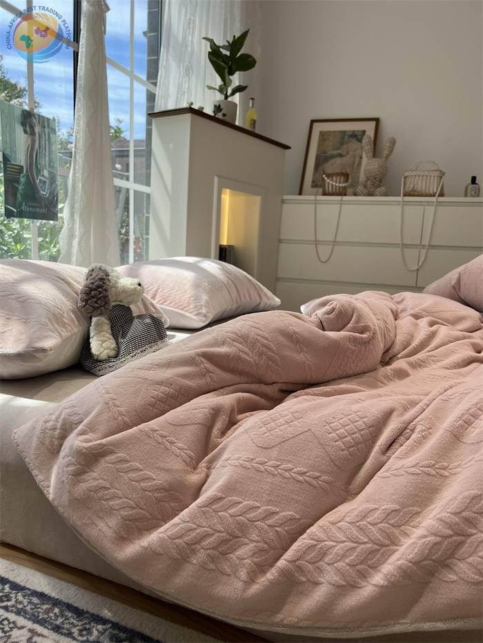 ins冬季法兰牛奶绒立体雕花简约奶黄色床上四件套珊瑚绒1.5m1.8米