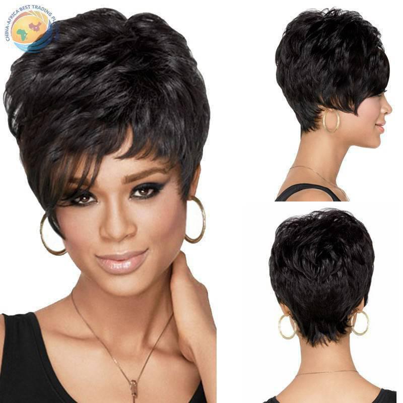 速卖通流行黑色假发蓬松短直发微卷发逼真黑色短发斜刘海假发头套