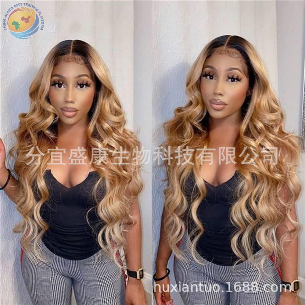 假发 欧美外贸化纤高温丝头套假发棕金色长卷发大波浪Wig假发头套