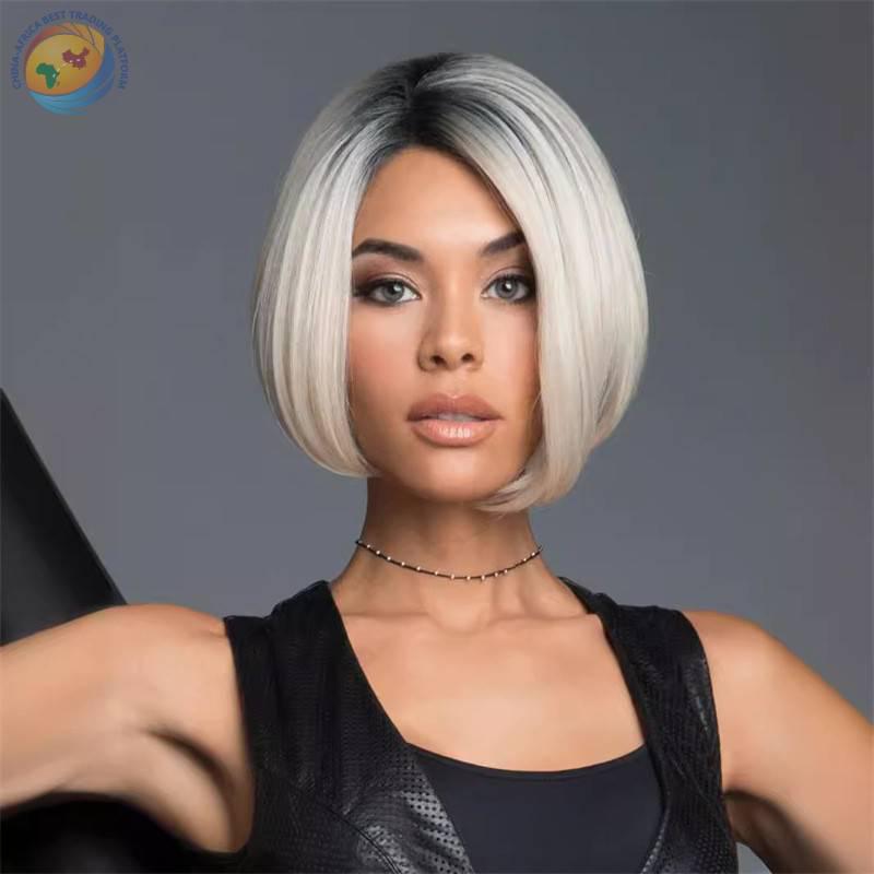 欧美假发头套 波波头化纤假发女 中分漂染棕色渐变中长款短发头套