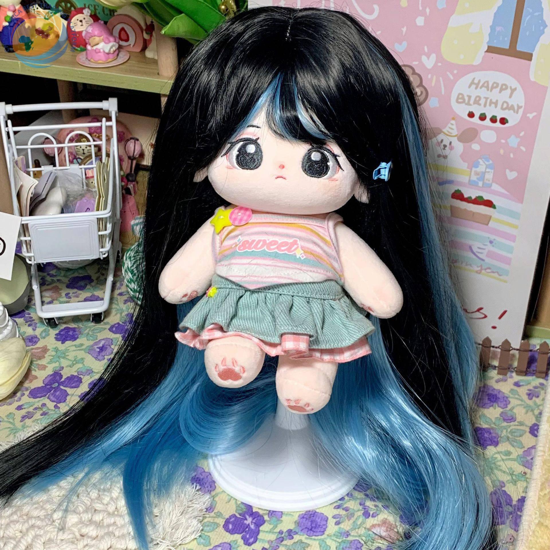 20cm cotton doll wig full head set high temperature silk chemical fiber black highlights blue long straight hair wig set