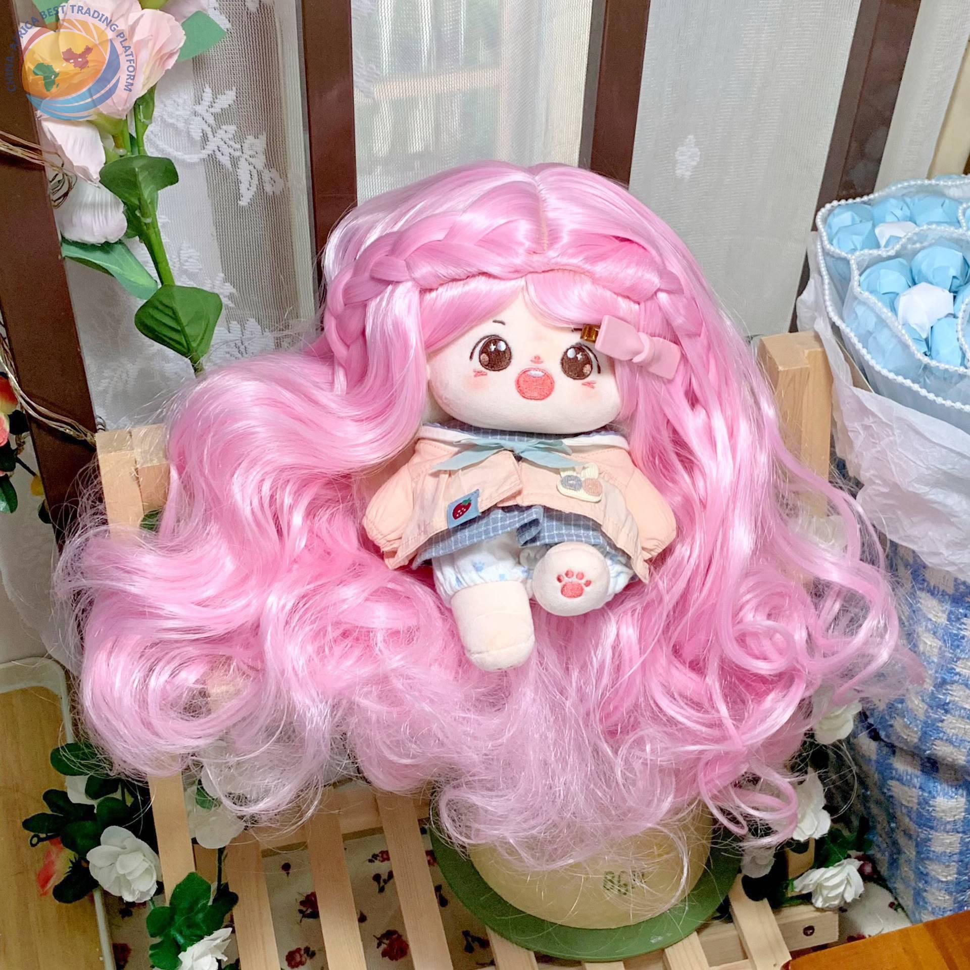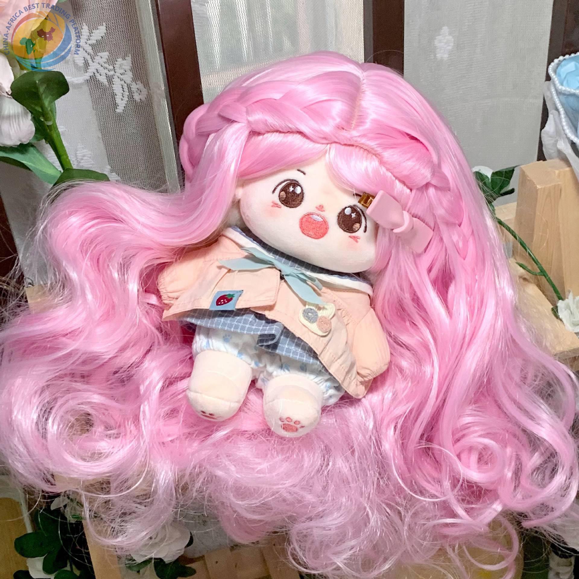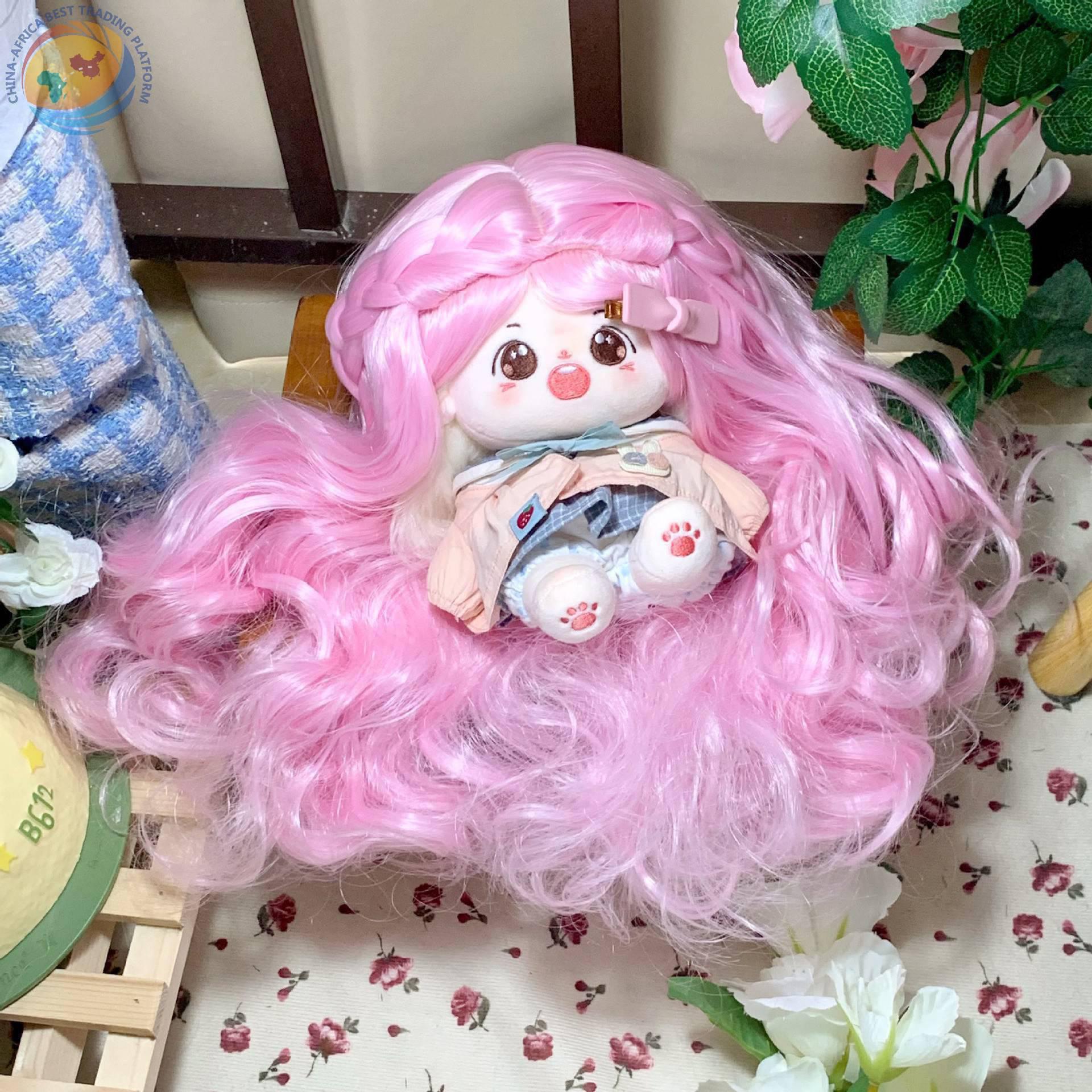 棉花娃娃新品假发20cm假发高温丝粉色长卷发人形玩偶公仔假头发套