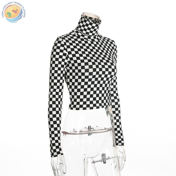 紧身高领格子格纹T恤女跨境速卖通亚马逊一件代发