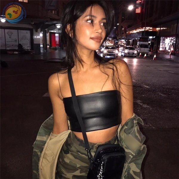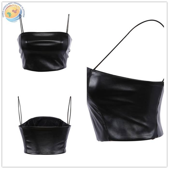 跨境新款欧美风性感细肩带黑色PU皮质吊带背心百搭修身抹胸春