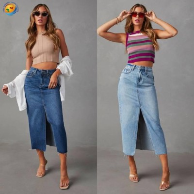 2024新款开叉牛仔半身裙女高腰水洗欧美风a字裙中长裙