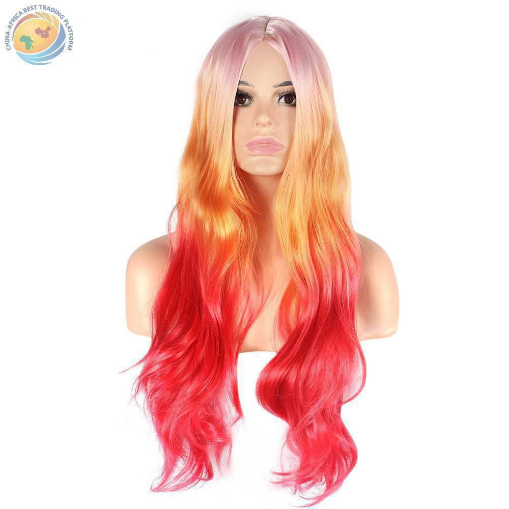 外贸欧美女士 机织化纤假发头套 长刘海中分微卷 棕色渐变粉色