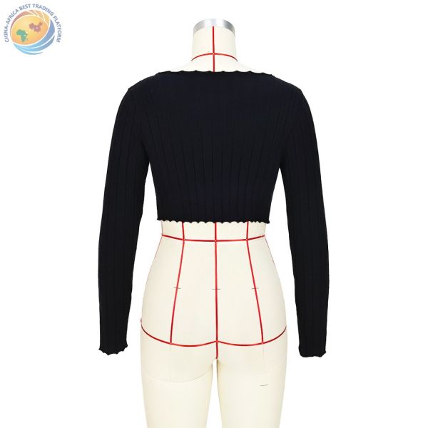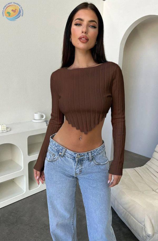 冬季新款欧美性感纯色坑条长袖针织短款露脐上衣