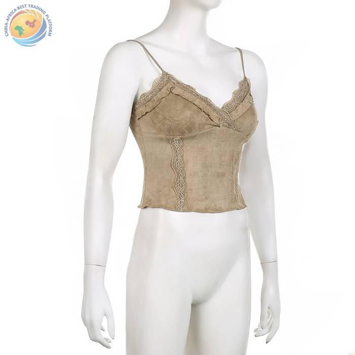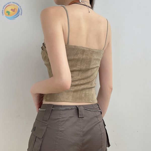褶皱丝绒花边吊带背心复古修身低领短上衣