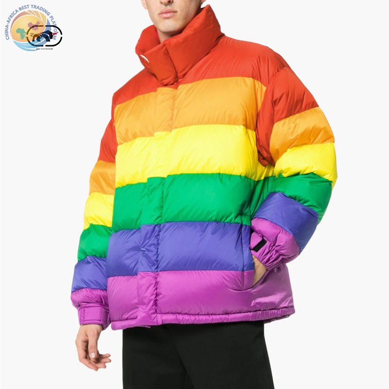 Custom Men's Winter Fashion Down Jacket Men Rainbow Stand Collar Zipper Oversized Down Puffer Jacket
