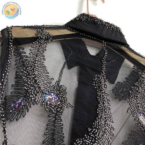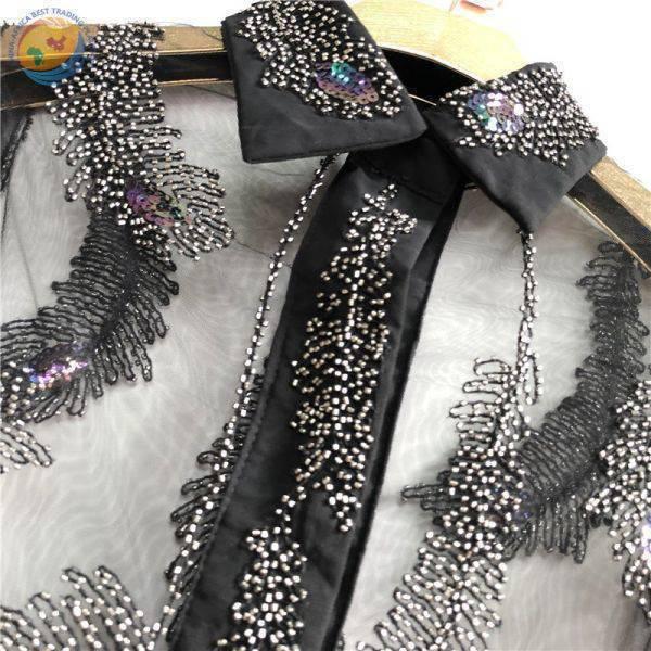 方领钉珠凤尾透视性感复古风长袖衬衫