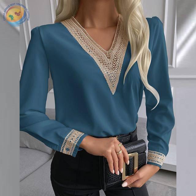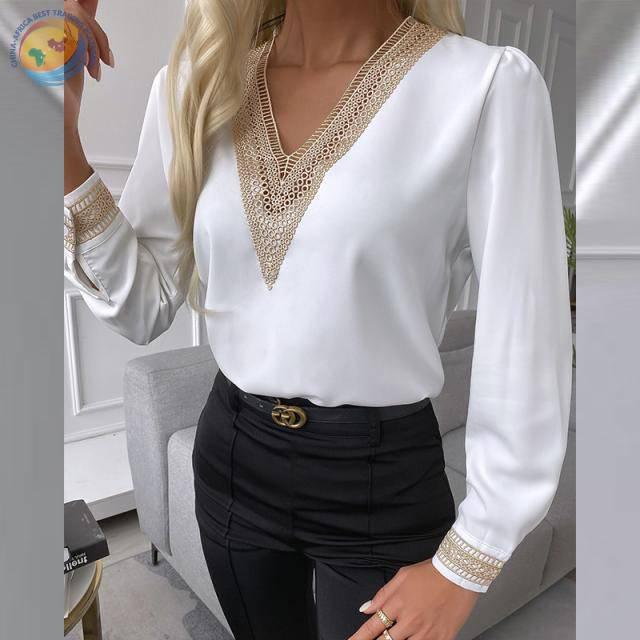 V领蕾丝镂空长袖衬衫白色上衣衬衣