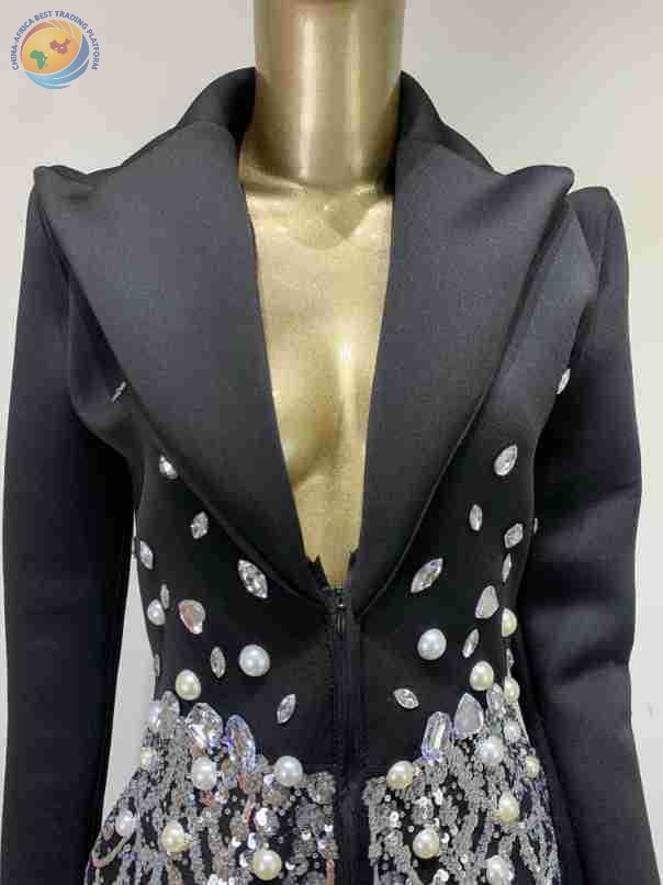 欧美西装裙派对晚礼服长袖水钻亮片超短连衣裙