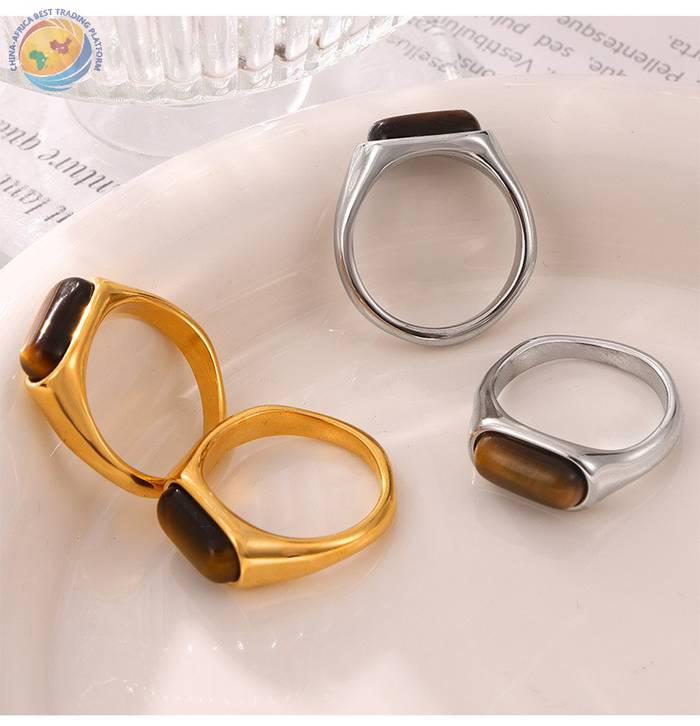 美拉德风几何饰品轻奢镶嵌虎眼石设计感钛钢镀金戒指