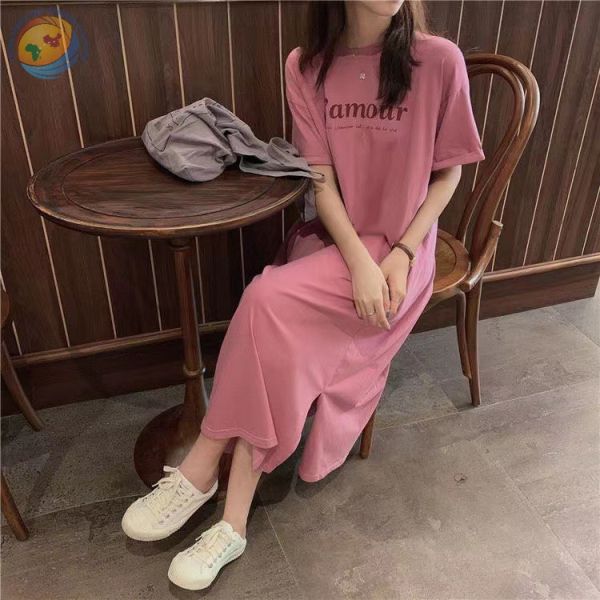 韩式时尚个性印花T恤长裙长款过膝连衣裙