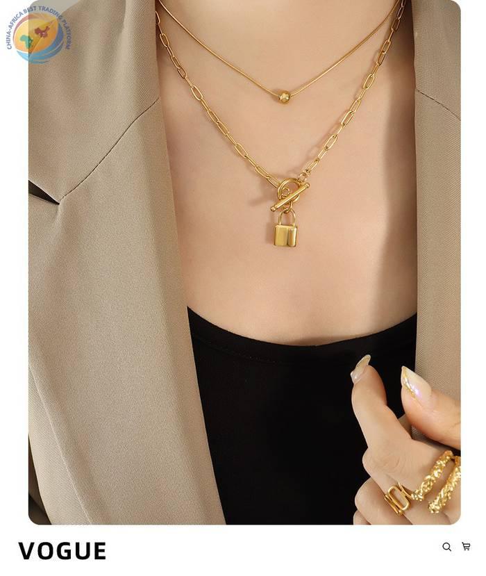 冷淡ins风潮款OT扣两戴锁头钢珠吊坠叠戴钛钢项链