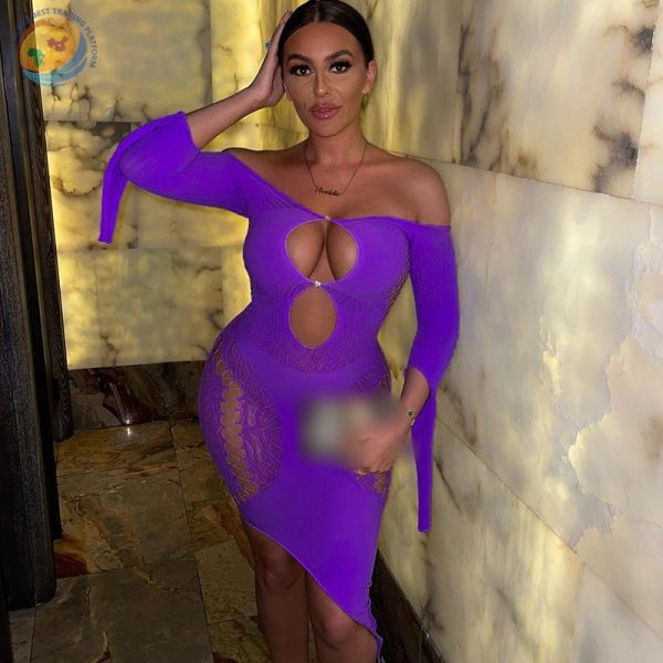 New line neckline, off-the-shoulder hollowed-out long-sleeved see-through dress