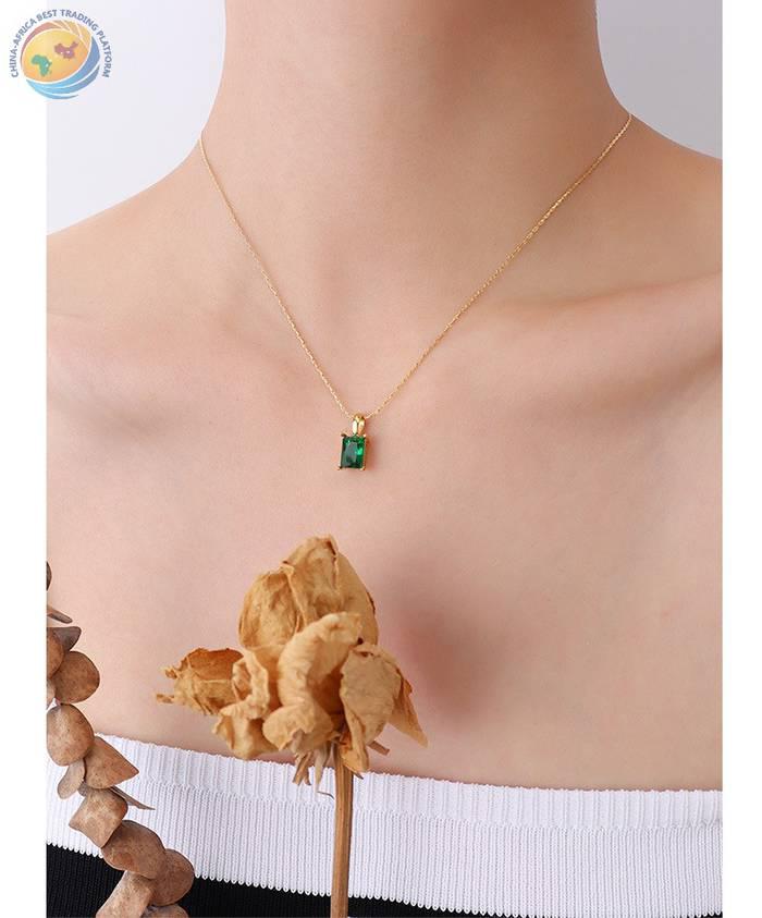 ins宫廷风祖母绿锆石吊坠宫廷风单钻项链钛钢镀18真金女饰品 P026