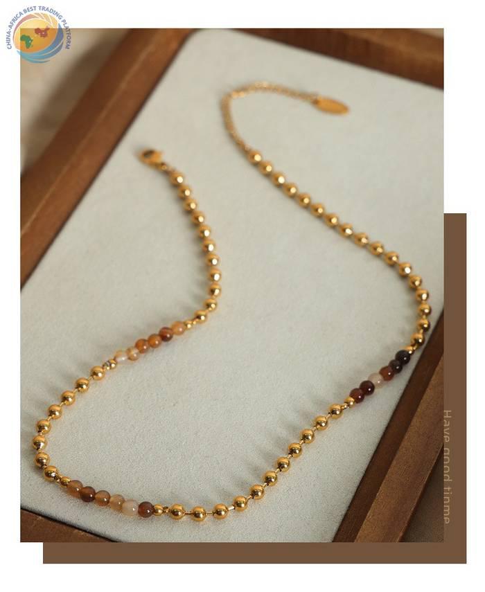 中古风新款时尚百搭个性钛钢镀金圆珠天然石手工串珠项链饰品批发