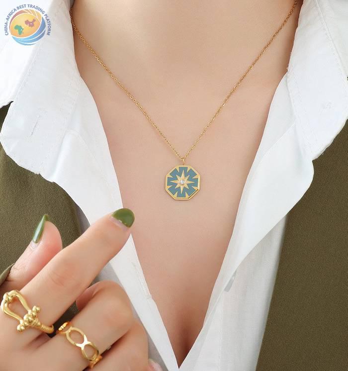 法式复古不掉色八芒星镶钻罗盘吊坠项链钛钢镀18K真金锁骨链 P093