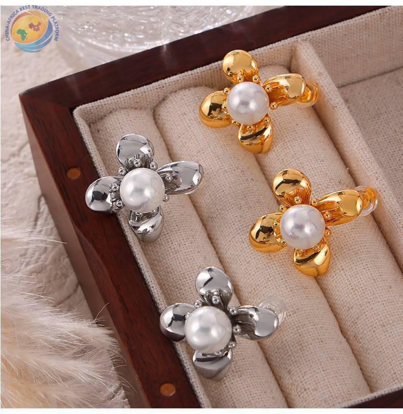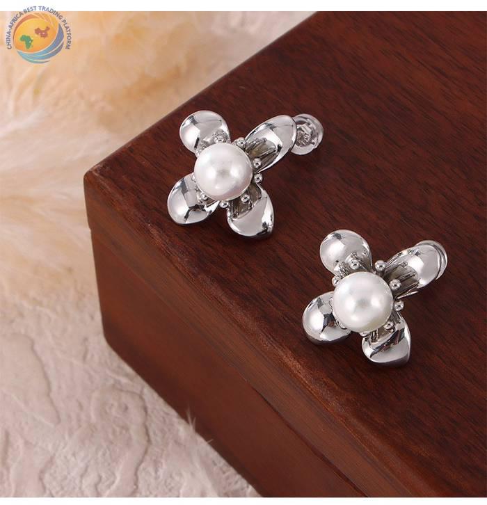 French niche cold wind geometric jewelry Flower set imitation pearl design sense titanium steel gold-plated earrings