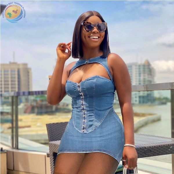 潮流纯色牛仔背心式连衣裙鱼骨束腰漏胸包臀短裙