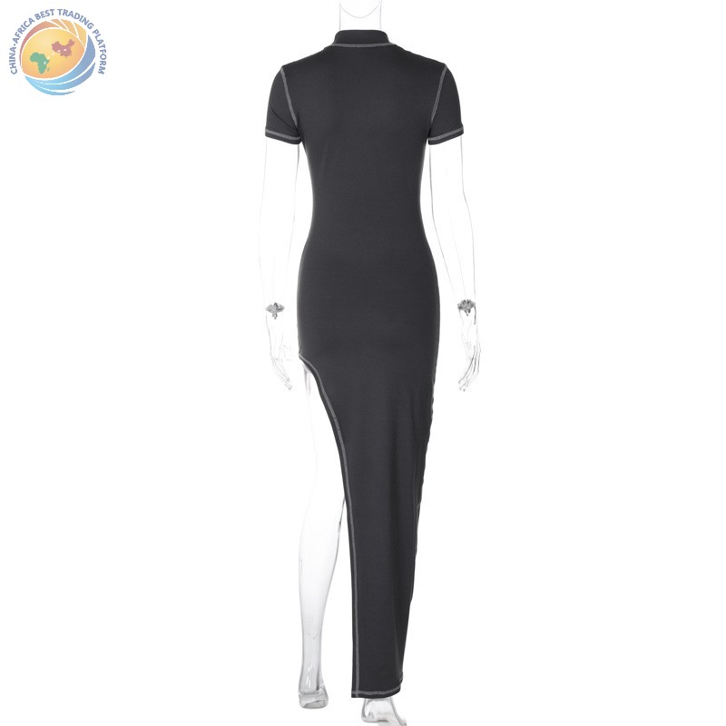 性感潮流纯色条纹设计高开叉紧身收腰短袖连衣裙女