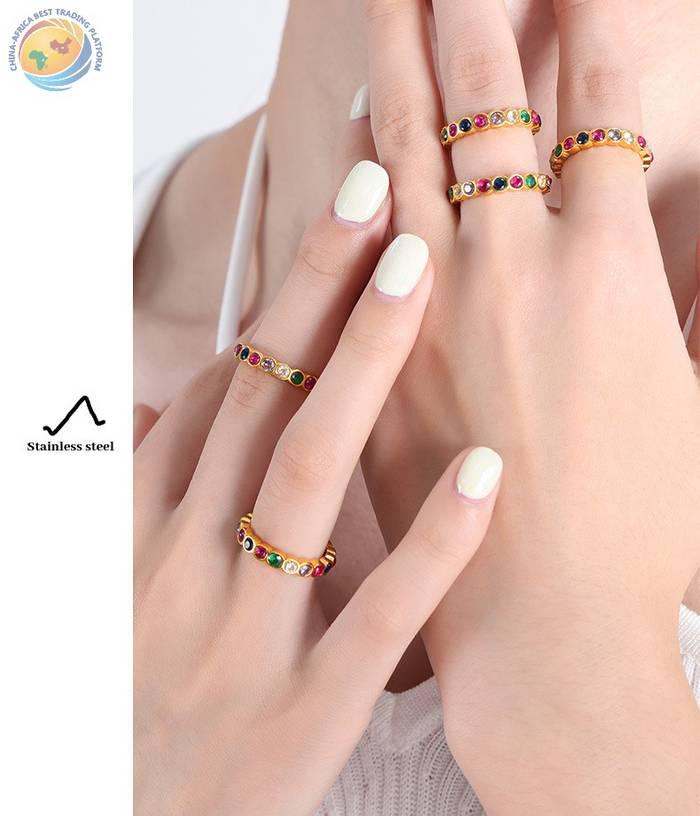 气质款钛钢镀金指环镶嵌多彩锆石轻奢戒指