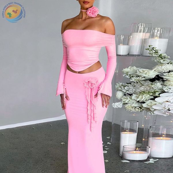 气质露腰一字肩系带花朵修饰紧身长袖半身裙套装