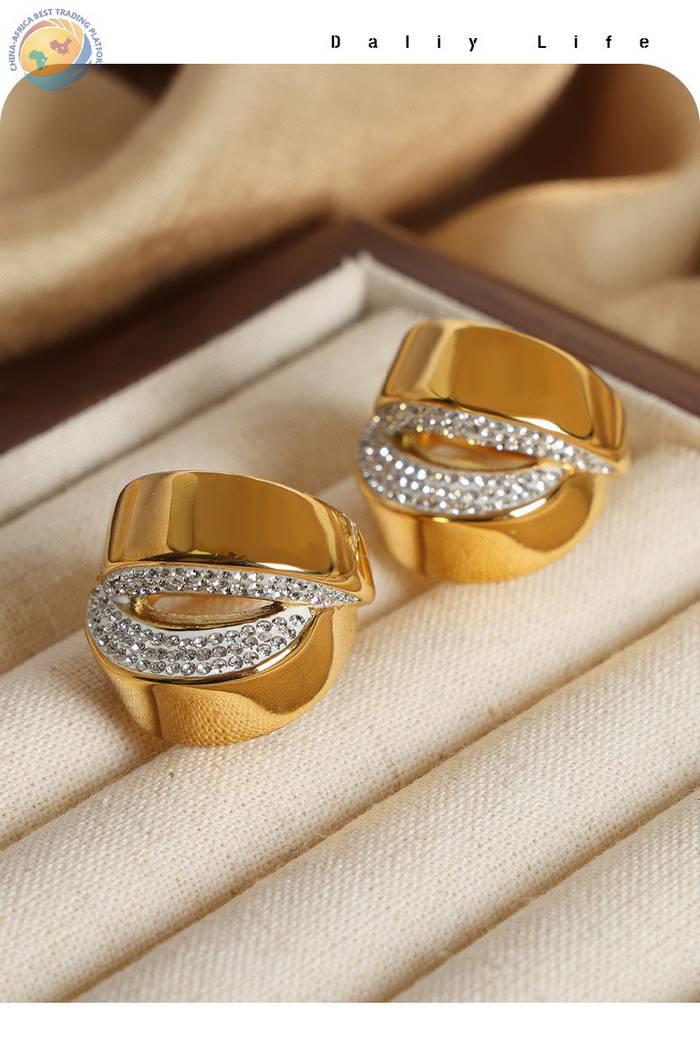 欧美新款时尚个性小众设计钛钢镀金不规则几何镶钻开口戒指饰品女