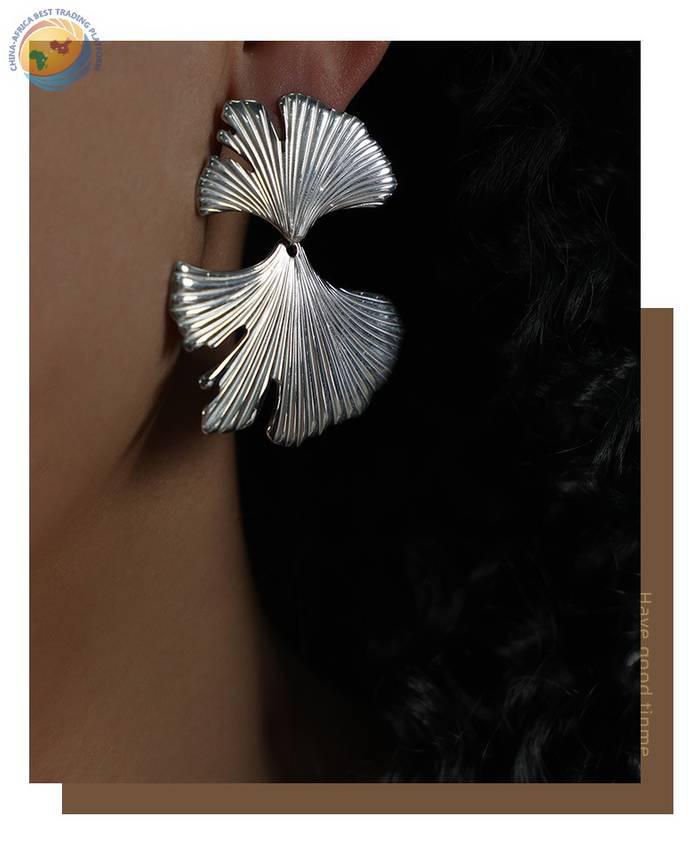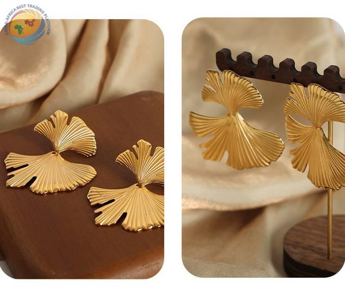 欧美新款时尚轻奢复古清新百搭钛钢镀金银杏叶耳环不规则饰品女