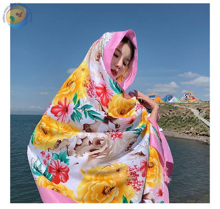 粉色花卉防晒披肩女薄款海南民族风纱巾海边