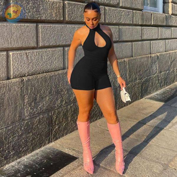 时尚气质纯色挂脖胸前镂空无袖紧身收腰连体裤