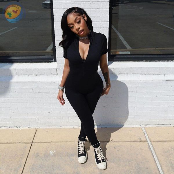 时尚街头纯色拉链紧身束腰显身材短袖紧身长款连体裤