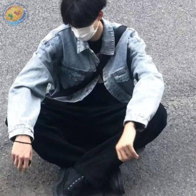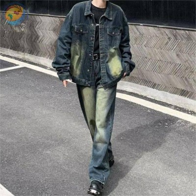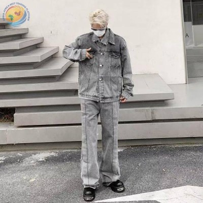 感垫肩牛仔外套男一整套做旧水洗夹克两件套