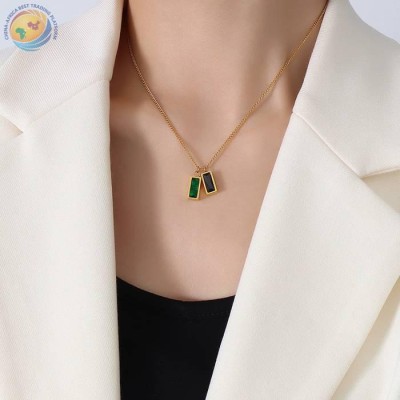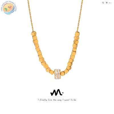 新款钛钢镀金方糖珠圆形镶钻吊坠项链