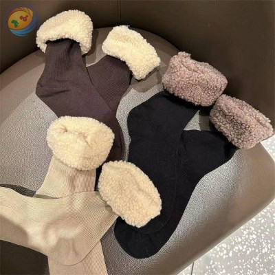 小众欧货秋冬翻边拼接羊羔毛袜子女中筒袜