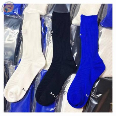 韩国潮牌双针黑蓝白刺绣纯棉长袜韩国设计师男女运动纯色中筒袜子