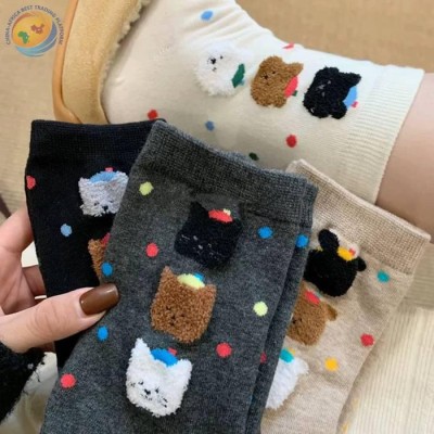 韩国东大门三只小熊植绒彩色波点中筒袜