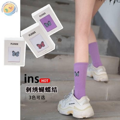 新品蝴蝶袜子刺绣韩国中筒女袜运动袜竖条纹滑板情侣网红运动长袜